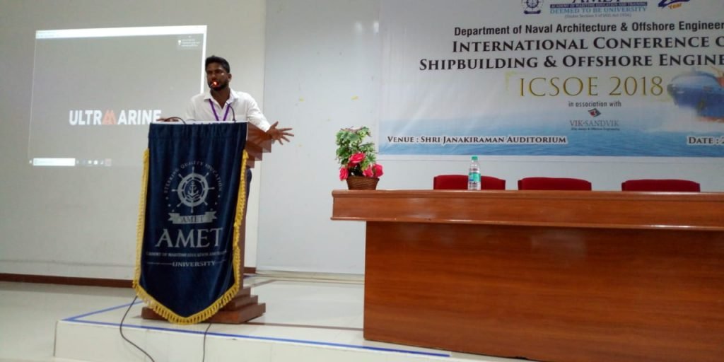 In 2018, Ultramarine participated in the International Conference on Shipbuilding & Offshore Engineering (ICSOE). Mr Nathanael Mallard was invited as the chief guest for the event which was held in AMET University, Chennai. He inaugurated the event by addressing the students about the current technology of the boat industry along with the advancement of the latest materials. Also, Mr Balakumar presented a paper on the topic “Composite Materials for Marine applications”. This visit to the university gave a good opportunity for the students to interact with us and gain more knowledge on the same.